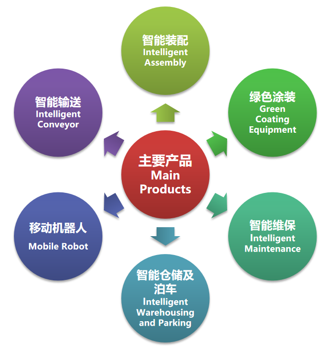 公司立足于汽車生產線和倉儲物流兩大行業,圍繞智能裝配、智能輸送、綠色涂裝三個傳統優勢產品、以及移動機器人、智能倉儲與泊車、智能維保三個新品等六大智能方向展開。
